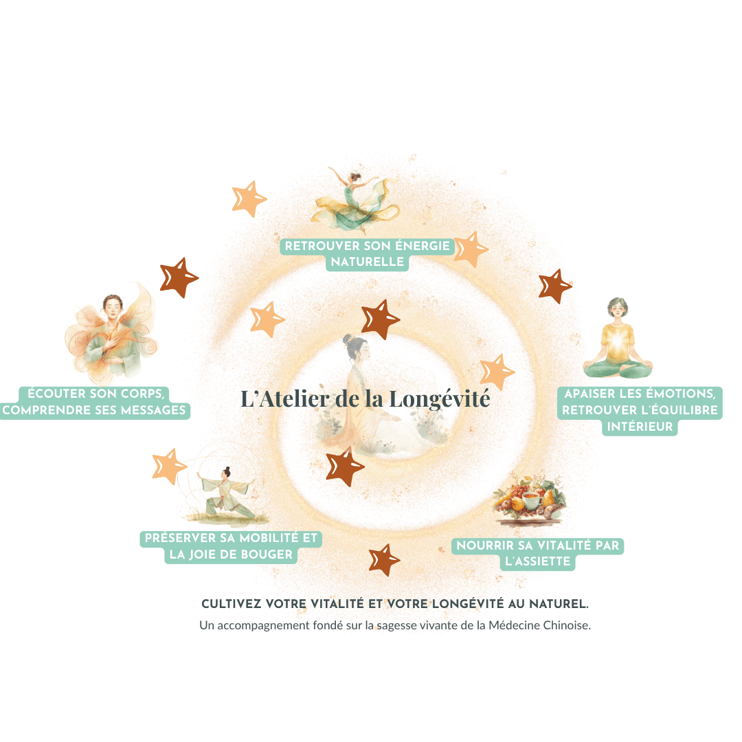 Ce n’est pas un programme rigide à suivre, mais un parcours vivant, inspiré de la Médecine Chinoise et du rythme des saisons, qui respecte votre âge, votre énergie et votre quotidien.