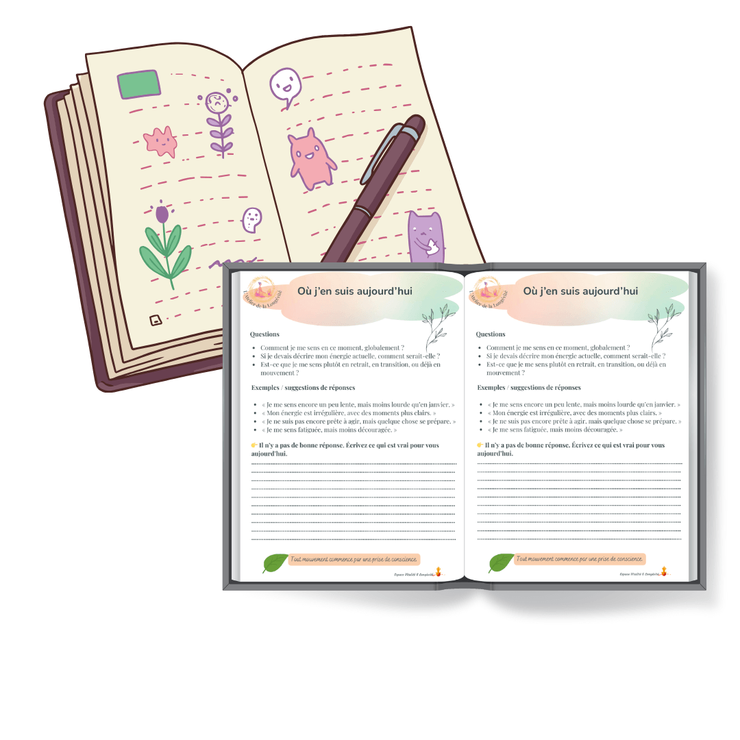 Chaque mois, un journal vous invite à poser des mots sur votre vécu, à observer votre énergie, votre sommeil, vos émotions et votre digestion, sans analyse compliquée.